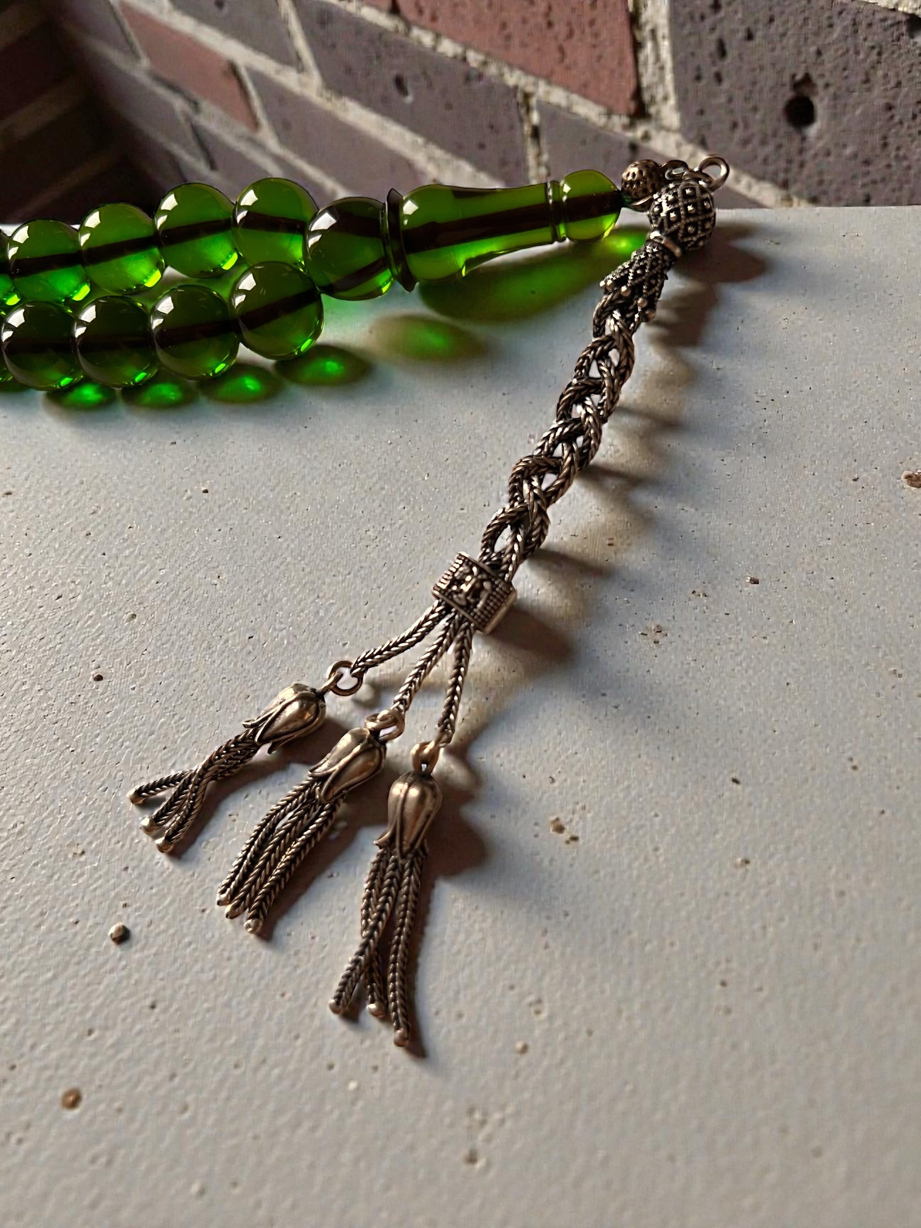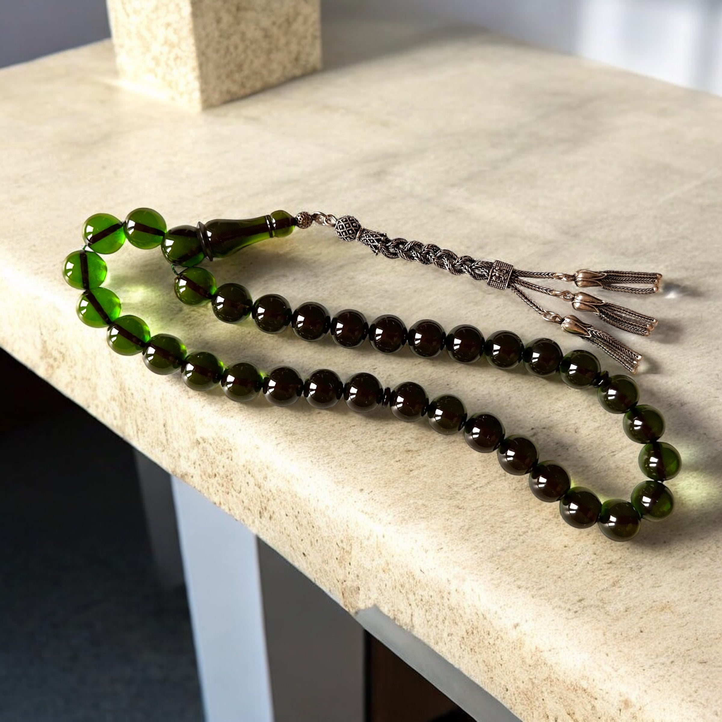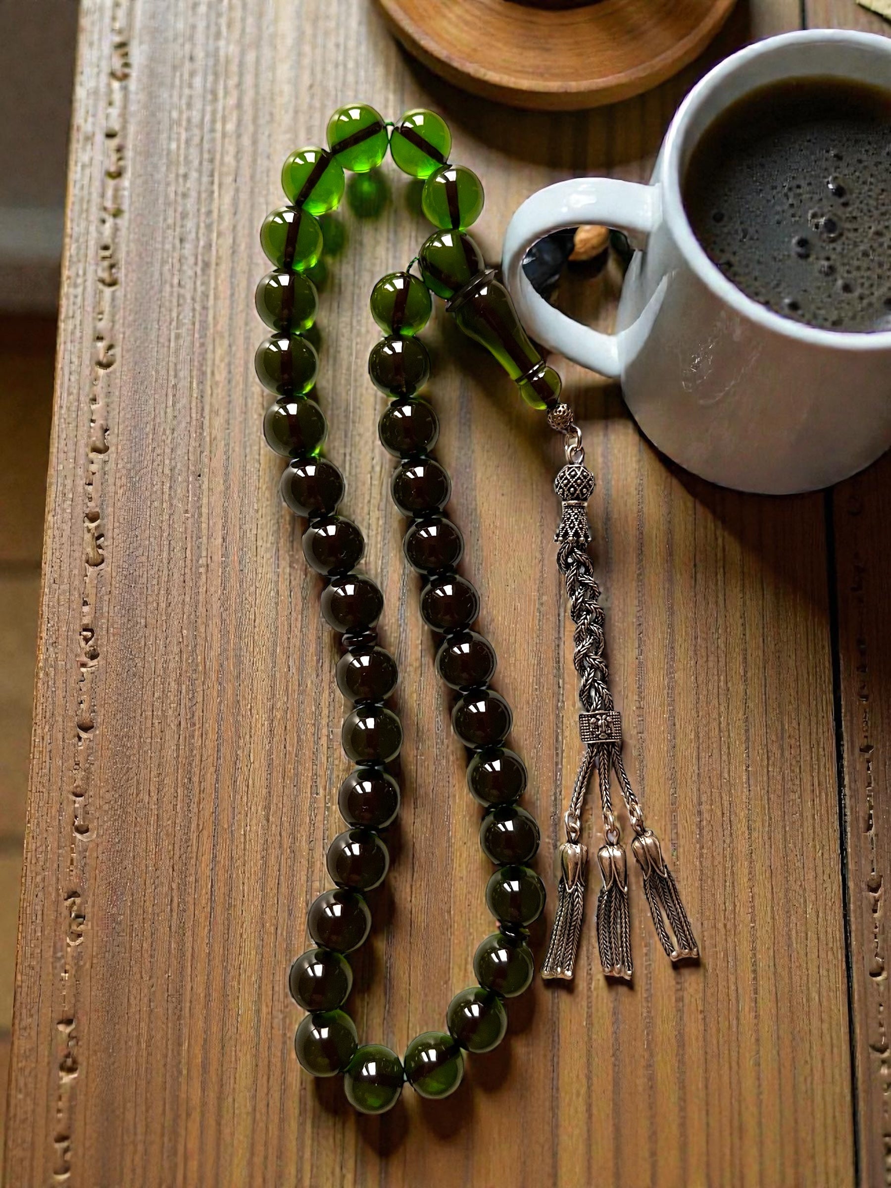 Bu Ateş Kehribar tesbih, derin koyu yeşil tonlarıyla asalet ve sadeliği bir araya getirir. Işığa tutulduğunda ortaya çıkan kristal parlaklığı, onu sıradan tesbihlerden hemen ayrıştırır.