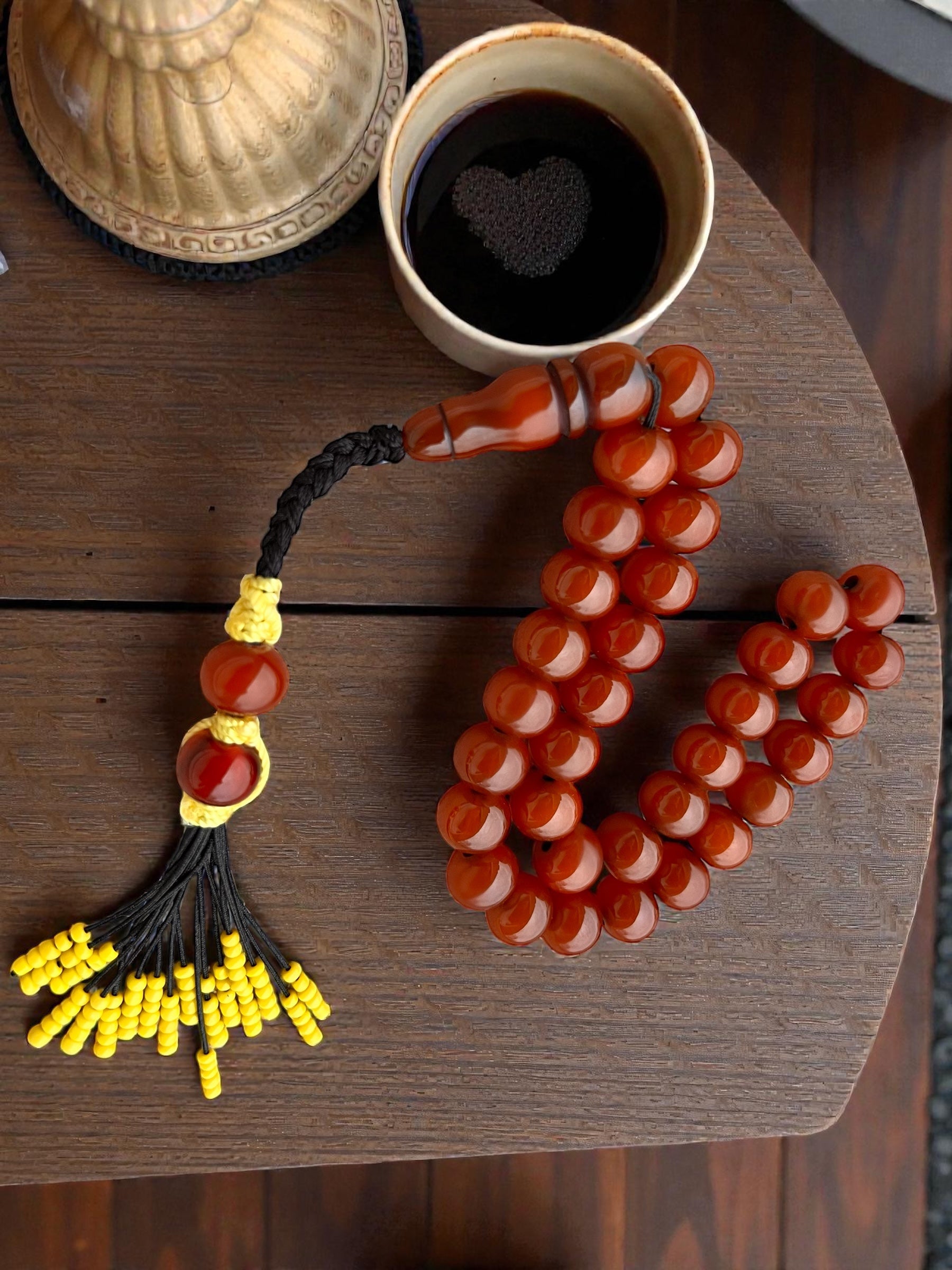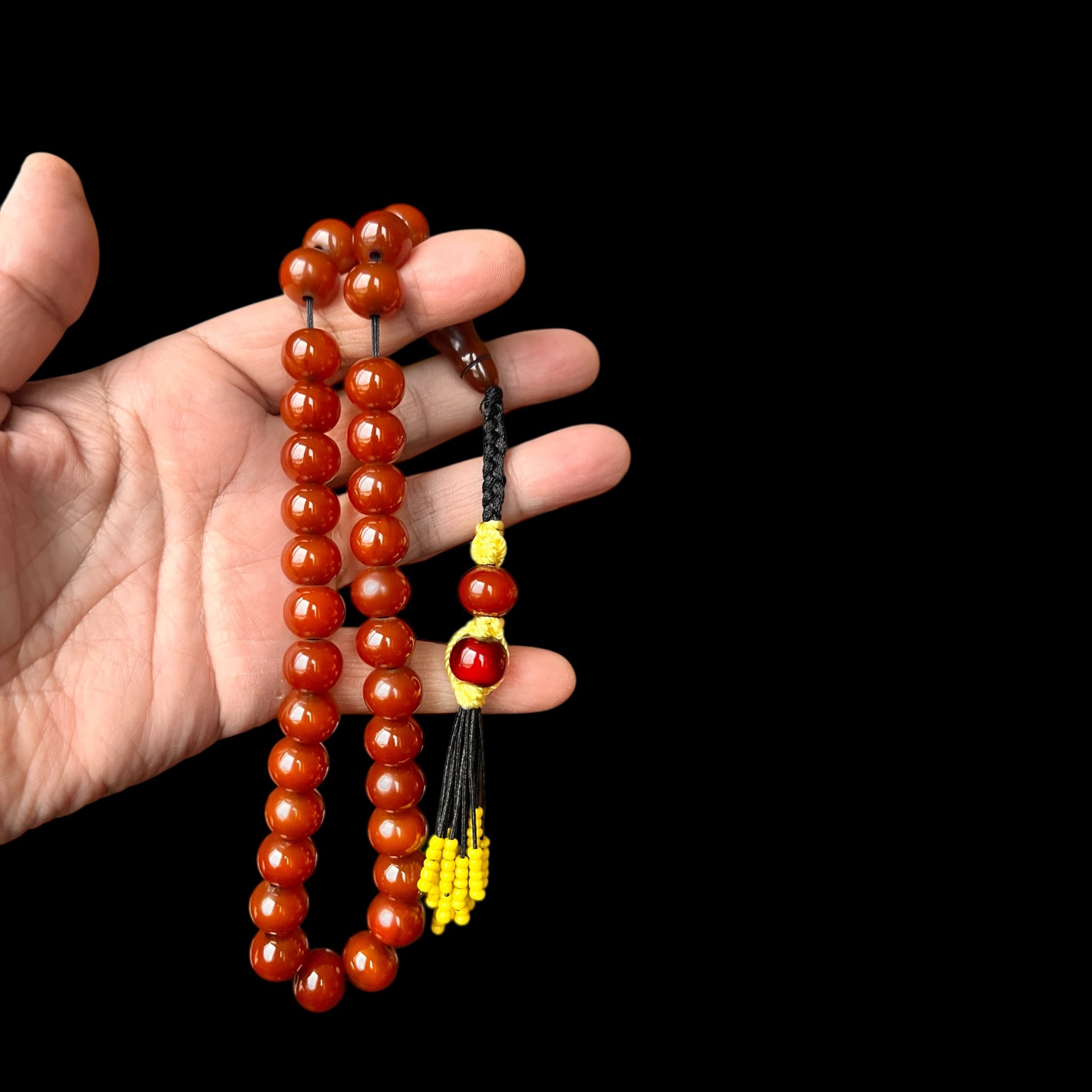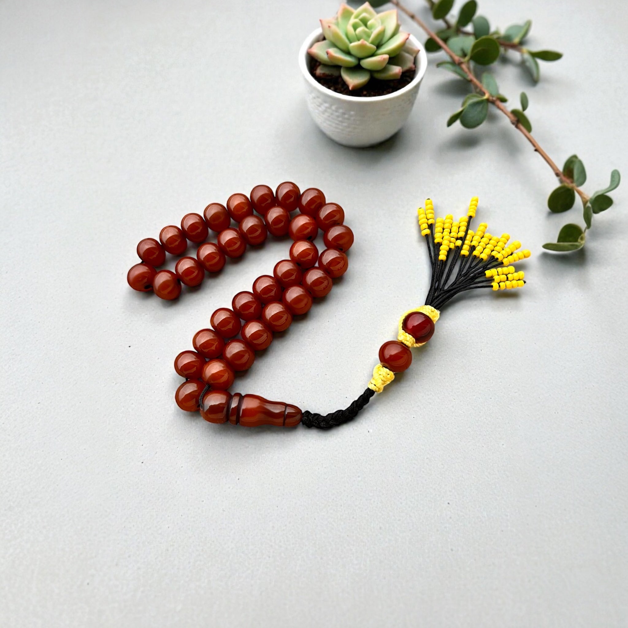 Kiremit kırmızısının sıcaklığıyla işlenmiş bu modern sıkma kehribar tesbih, hem günlük çekim için hem de koleksiyonluk bir parça olarak öne çıkıyor. Renk geçişsiz, parlak ve sağlam taneleri elde rahatça kayar. Ucundaki sarı detaylı püskül, tesbihe genç ve enerjik bir hava katar.